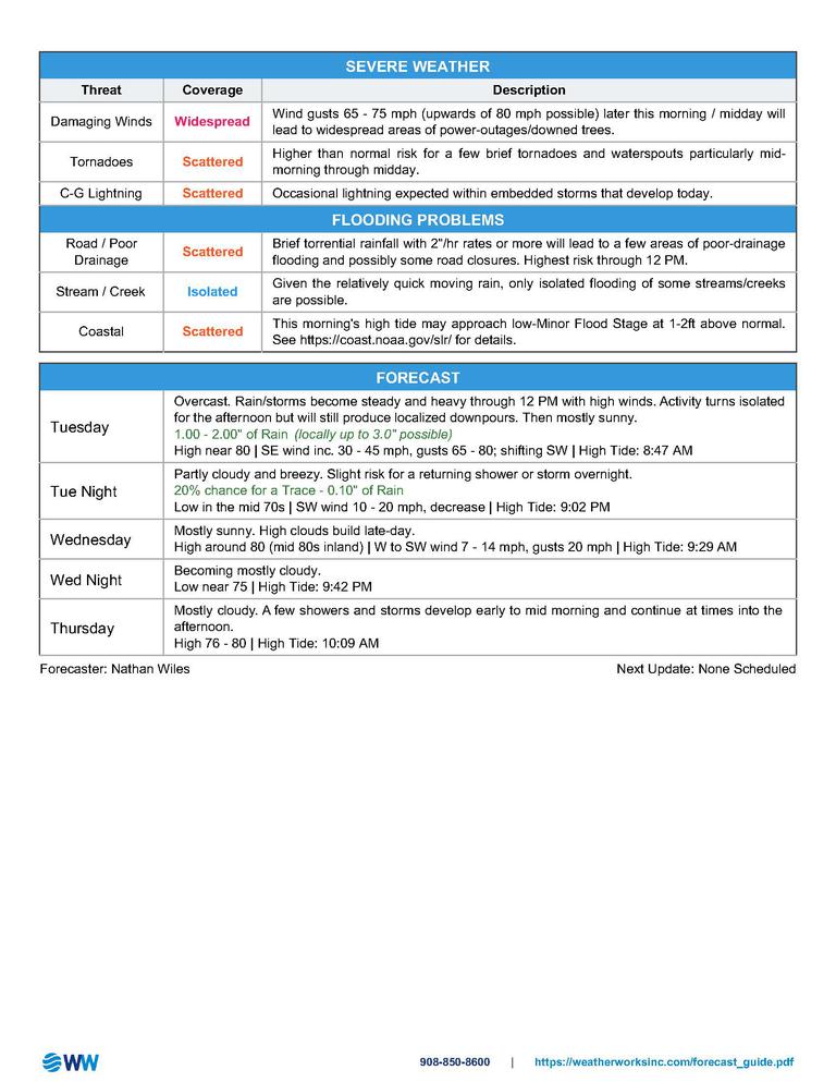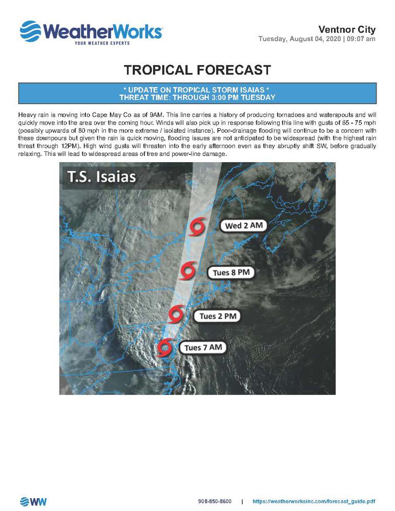 A heavy band from Isaias will arrive 9:45 to 10:15 a.m. continuing through at least 11:30 a.m. This band is producing torrential rainfall, has a history of producing waterspouts and tornadic activity. After this, expect winds directly associated with the tropical system to ramp up. Click here to download the below update on Hurricane Isaias.