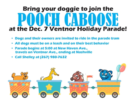 Join the holiday fun with your furry friend! Bring your dog to the Ventnor Holiday Parade on Saturday, December 7, and ride along in the "Pooch Caboose!"