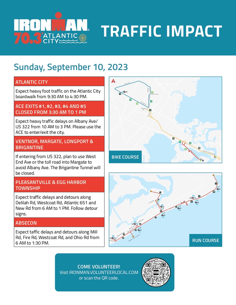 The race will also impact traffic in our area. Visit IRONMAN 70.3 Atlantic City for more information or see the image below: