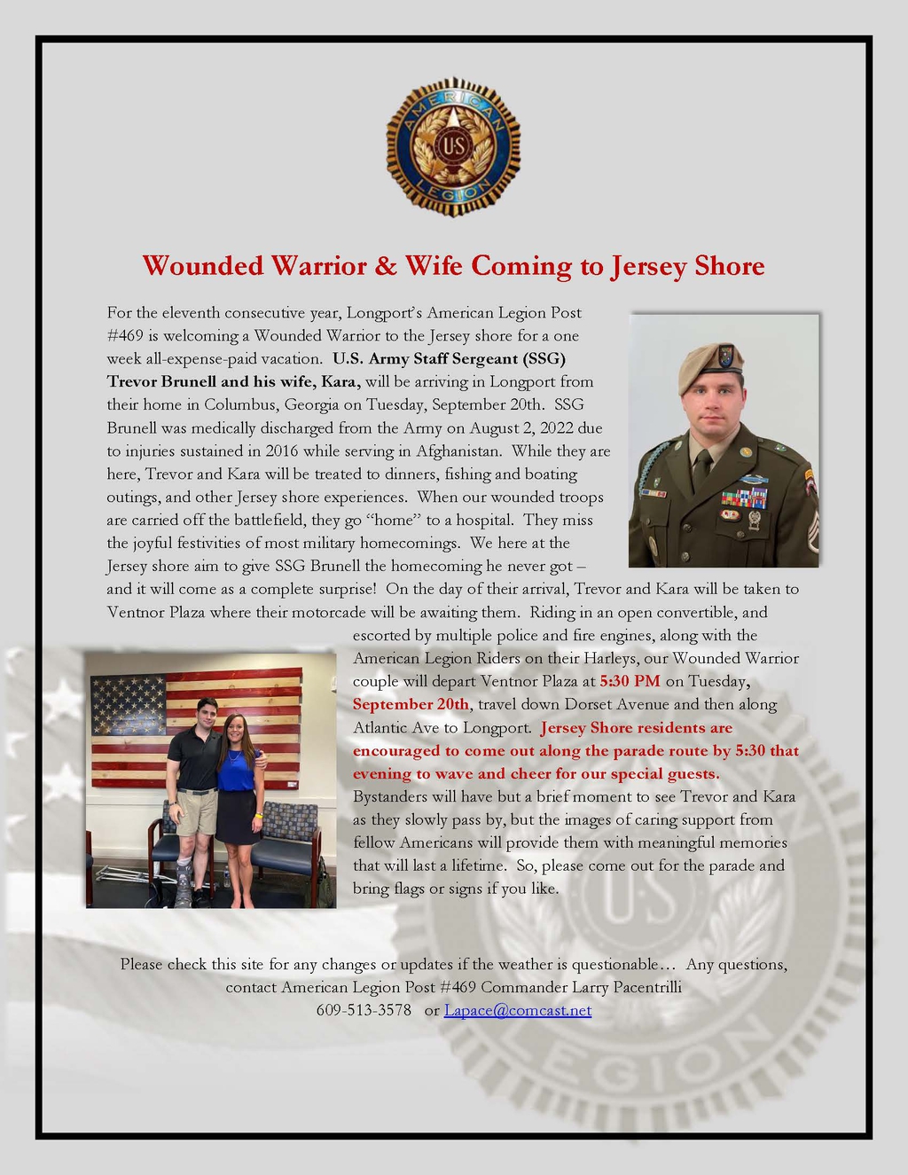 When Trevor and Kara arrive, they will be expecting a welcoming BBQ with local folks. hey will know nothing about a motorcade parade. Legion members will bring the family to the Ventnor Plaza Shopping Center parking lot at 5:20 PM on September 20th. They will then be placed in an open limo for their SURPRISE motorcade/parade down Dorset and Atlantic Avenues through Ventnor, Margate and Longport, to the park behind Longport’s Borough Hall for the welcoming BBQ.