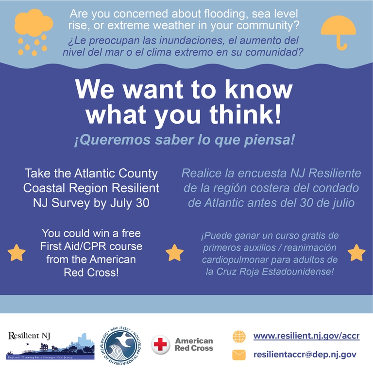 ¿Le preocupan las inundaciones, el aumento del nivel del mar y el clima extremo en su comunidad? ¡Responda a la encuesta de #NJResiliente de la Región Costera del Condado de Atlantic antes del 30 de julio para dar su opinión! https://www.surveymonkey.com/r/5FR9KGG