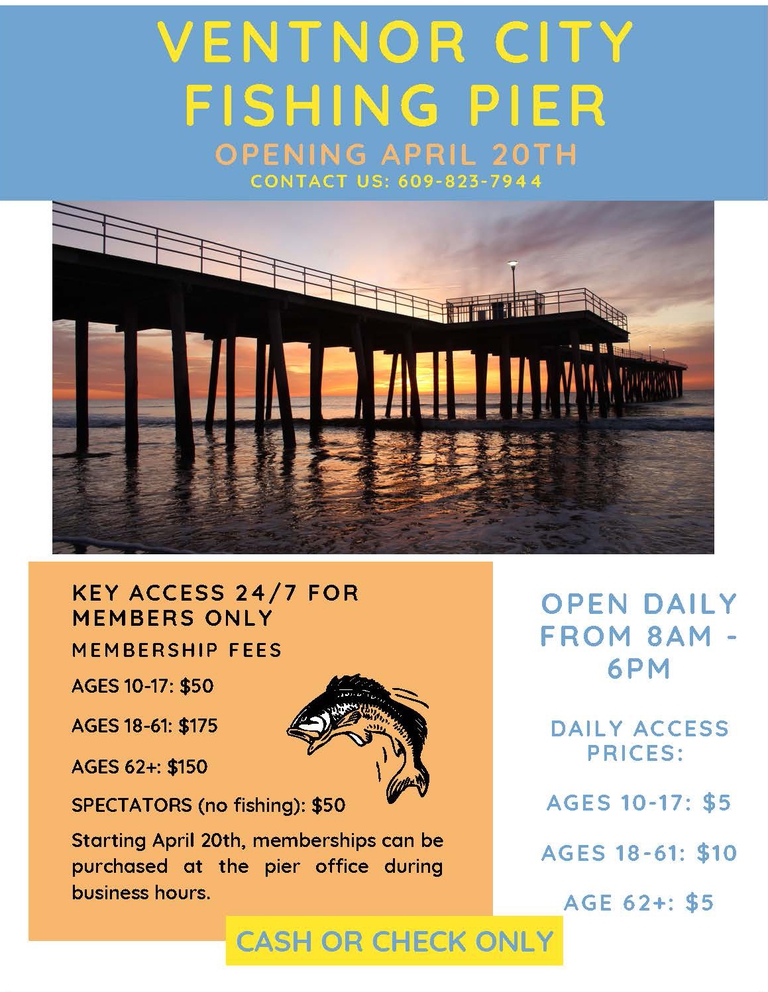 The Ventnor City Fishing Pier will open for the season on Tuesday, April 20, 2021. The pier will be open daily from 8 a.m. to 6 p.m. for the season. Key access is available for members. For more information call 609.823.7944.