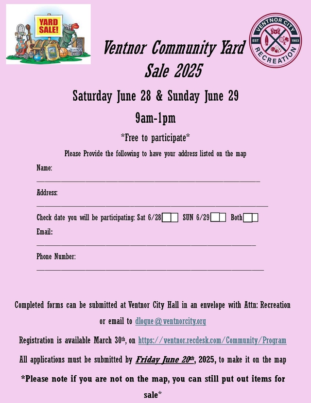 The Ventnor Community Yard Sale will be held on Saturday, June 28, 2025, and Sunday, June 29, 2025, from 9 a.m. to 1 p.m. The event is free for residents to participate, and residents can sign up to be listed on the official yard sale map.